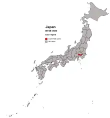 The first known case of the mpox outbreak in Japan was detected on 25 July 2022. According to the Ministry of Health, the index case was a man in his 30s who had recently traveled to Europe, and he had contact with someone who was later diagnosed with mpox.[10] On 28 July 2022, Japan confirmed its second case of mpox, from a man in his 30s in Tokyo and he had recently traveled abroad. It was officially said one victim had no contact with the other victim.[11] On 5 August 2022, Japan confirmed an additional mpox case. On August 11, a fourth case was reported. On October 6, 2 new cases were reported. One day later, a 7th case was reported. On December 29, an 8th case was reported.