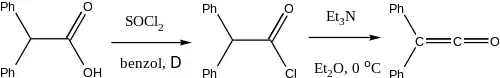 Diphenylketene is produced by the elimination of hydrogen chloride from diphenylacetyl chloride in the presence of triethylamine.[4]