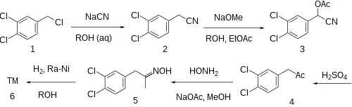 The reaction of 3,4-Dichlorobenzyl Chloride [102-47-6] (1) with cyanide anion gives 3,4-Dichlorophenylacetonitrile [3218-49-3] (2). Reaction with sodium methoxide and ethylacetate gives Alpha-Acetoxy-3,4-Dichlorobenzeneacetonitrile, CID:14318103 (3). Removal of the nitrile group in the presence of sulfuric acid gives 3,4-Dichlorophenylacetone [6097-32-1] (4). Oxime formation with hydroxylamine gives N-[1-(3,4-dichlorophenyl)propan-2-ylidene]hydroxylamine, CID:74315855 (5). Reduction of the oxime completed the synthesis of 3,4-Dichloroamphetamine (6).