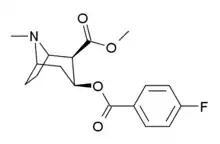 4′-Fluorococaine is a tropane derivative drug which is a synthetic analogue of cocaine. Unlike related compounds such as the corresponding 4′-fluorophenyltropane derivative CFT and the 2′-hydroxy analogue salicylmethylecgonine, 4′-fluorococaine has only around the same potency as cocaine as an inhibitor of dopamine reuptake, but conversely it is a much stronger serotonin reuptake inhibitor than cocaine, resulting in a significantly altered pharmacological profile in animal studies.[1]
