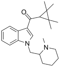 AB-005 or [1-[(1-methylpiperidin-2-yl)methyl]-1H-indol-3-yl](2,2,3,3-tetramethylcyclopropyl)-methanone is a designer drug offered by online vendors as a cannabimimetic agent. The structure and pharmacological activity of AB-005 was published in 2010, prior to its commercial availability in 2012, where it was reported to have high affinity for both CB1 (Ki = 5.5 nM) and CB2 receptors (Ki = 0.48 nM).[1] AB-005 features groups found in other previously reported synthetic cannabinoids: the tetramethylcyclopropane group of UR-144 and XLR-11 as well as the (1-methyl-2-piperidinyl)methyl substituent of AM-1248 and AM-1220. No information regarding the in vivo activity of AB-005 has been published, and only anecdotal reports are known of its psychoactivity in humans.