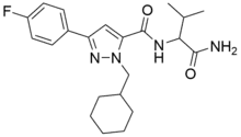 AB-CHFUPYCA (also AB-CHMFUPPYCA)[1] is a compound that was first identified as a component of synthetic cannabis products in Japan in 2015.[2][3] The name "AB-CHFUPYCA" is an acronym of its systematic name N-(1-Amino-3-methyl-1-oxoButan-2-yl)-1-(CycloHexylmethyl)-3-(4-FlUorophenyl)-1H-PYrazole-5-CarboxAmide. There are two known regioisomers of AB-CHFUPYCA: 3,5-AB-CHMFUPPYCA (pictured) and 5,3-AB-CHMFUPPYCA.[4] The article[1] refers to both 3,5-AB-CHMFUPPYCA and 5,3-AB-CHMFUPPYCA as AB-CHMFUPPYCA isomers, so AB-CHMFUPPYCA and AB-CHFUPYCA are not names for a unique chemical structure.