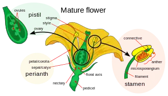 A flower's anatomy, as defined by the presence of a series of organs (sepals, petals, stamens and carpels) positioned according to a given pattern, facilitate sexual reproduction in flowering plants. The flower arises from the activity of three classes of genes, which regulate floral development:[8]