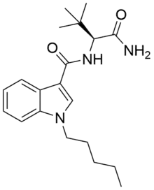 ADBICA (also known as ADB-PICA) is a designer drug identified in synthetic cannabis blends in Japan in 2013.[1] ADBICA had not previously been reported in the scientific literature prior to its sale as a component of synthetic cannabis blends. ADBICA features a carboxamide group at the 3-indole position, like SDB-001 and STS-135. The stereochemistry of the tert-butyl side-chain in the product is unresolved, though in a large series of indazole derivatives structurally similar to ADBICA that are disclosed in Pfizer patent WO 2009/106980, activity resides exclusively in the (S) enantiomers.[2] ADBICA is a potent agonist of the CB1 receptor and CB2 receptor with an EC50 value of 0.69 nM and 1.8 nM respectively.[3]