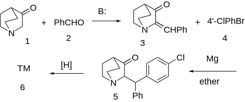 The first-step is a mixed-aldol condensation between 3-quinuclidinone [3731-38-2] (1) and benzaldehyde (2) gives 2-benzylidene-3-oxoquinuclidine [24123-89-5] (3). The conjugate addition of the Grignard reagent formed from 4-bromochlorobenzene [106-39-8] (4) to the enone gives the benzhydryl (5). MPV reduction of the carbonyl gives the syn stereoisomers, whereas borohydride gave trans. Both diastereoisomers are active but in only one of the enantiomers.
