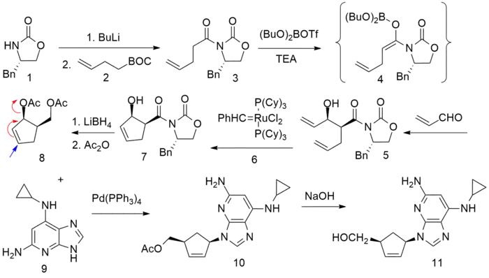 - Crimmins MT, King BW (June 1996). "An Efficient Asymmetric Approach to Carbocyclic Nucleosides: Asymmetric Synthesis of 1592U89, a Potent Inhibitor of HIV Reverse Transcriptase". The Journal of Organic Chemistry. 61 (13): 4192–4193. doi:10.1021/jo960708p. PMID 11667311.