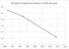Between 1982 and 1992, the number of abortion clinics in the state decreased by ten, going from 55 in 1982 to 45 in 1992.[59] In 2014, there were twelve abortion clinics in the state.[60] In 2014, 93% of the counties in the state did not have an abortion clinic. That year, 56% of women in the state aged 15–44 lived in a county without an abortion clinic.[33] In March 2016, there were 28 Planned Parenthood clinics in the state.[61] In 2017, there were 27 Planned Parenthood clinics serving a population of 2,585,171 women aged 15–49. Three of the Planned Parenthood clinics offered abortion services.[62]
