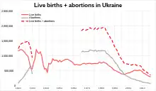Prior to 1991, abortion in Ukraine was governed by the abortion laws of the Soviet Union. The laws have not changed since then. Abortion rates have fallen from 109 abortions per 1000 women aged 15–44 in 1986 to 80.9 in 1991, 67.2 in 1996[1] and 27.5 in 2004.[2] As of 2010, the abortion rate was 21.2 abortions per 1000 women aged 15–44.[3] In 2014 the abortion rate in Ukraine decreased to 14.89 per 1000 women aged 15–44.[4] Abortion rates in Ukraine and Belarus have converged in recent years, creating a large gap with post-Soviet Russia.[5][nb 1]