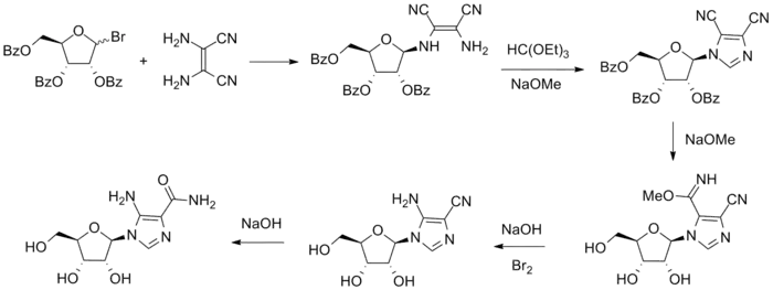Reaction of 2-bromo tribenzoyl ribose with diaminomaleonitrile results in the displacement of the anomeric halogen by one of the amino groups and the formation of the aminosugar largely as the β-anomer. Treatment of this product with methyl orthoformate in the presence of a base leads to the replacement of the alkoxy groups in orthoformate by the adjacent amines, resulting in the formation of the imidazole ring. Reaction with alkoxide then converts the nitrile nearest the sugar to an iminoester; the benzoyl groups are cleaved in the process. Hofmann rearrangement in the presence of a bromine and a base converts the iminoester to the corresponding primary amine. Basic hydrolysis then converts the remaining nitrile to an amide, affording acadesine.[7]
