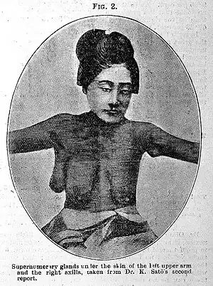 Accessory breasts, also known as polymastia, supernumerary breasts, or mammae erraticae, is the condition of having an additional breast. Extra breasts may appear with or without nipples or areolae. It is a condition and a form of atavism which is most prevalent in male humans, and often goes untreated as it is mostly harmless. In recent years, many affected women have had a plastic surgery operation to remove the additional breasts, for purely aesthetic reasons.