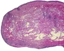 These structures are distinctly different from squamous papilloma and benign teratoma.