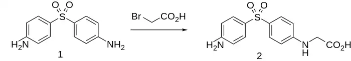In the search for more easily administered drugs, dapsone (1) was reacted with bromoacetic acid to give acediasulfone (2) which can be administered as a water-soluble salt.