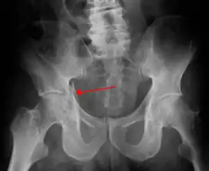 Fractures of the acetabulum occur when the head of the femur is driven into the pelvis. This injury is caused by a blow to either the side or front of the knee and often occurs as a dashboard injury accompanied by a fracture of the femur.[1]