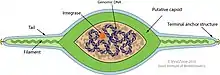 Viruses in Bicaudaviridae are non-enveloped, with lemon-shaped geometries. Genomes are circular dsDNA molecules of around 48–76 kb in length. High-resolution structure was determined by cryo-EM for Sulfolobus monocaudavirus 1 (SMV1) and a lower-resolution structure was determined for Acidianus two-tailed virus (ATV).[6] Virions of both viruses have helical symmetry, with continuous 7-start helices, composed of the single major capsid protein, forming both the tails and the spindle-shaped body. The major capsid protein structure and virion organization of bicaudaviruses are similar to those of archaeal viruses from the families Fuselloviridae, Thaspiviridae, Halspiviridae and Clavaviridae.[6]