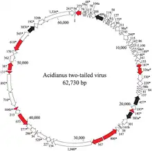 Genome organization of Acidianus two-tailed virus showing location, sizes and transcriptional direction of the putative genes
