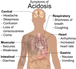 Nervous system involvement may be seen with acidosis and occurs more often with respiratory acidosis than with metabolic acidosis. Signs and symptoms that may be seen in acidosis include headaches, confusion, feeling tired, tremors, sleepiness, flapping tremor, and dysfunction of the cerebrum of the brain which may progress to coma if there is no intervention.[2]