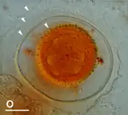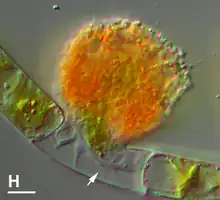 One of the earliest unambiguous reports of a vampyrellid is the mid-19th century description of Amoeba lateritia (now known as Vampyrella lateritia) by the German botanist Georg Fresenius.[12] The first extensive documentation of their life history and feeding behavior was provided in 1865 by the Polish protozoologist Leon Cienkowski, who created the genus Vampyrella and classified it in a subgroup of the 'monads',[13] a polyphyletic assemblage of parasitoid protists. Posterior works and monographs described numerous aquatic vampyrellid species, with important observations of their behaviour and ecology. In 1885, the German mycologist Wilhelm Zopf demonstrated the presence of nuclei in vampyrellids and erected the first family, Vampyrellidae.[14][15][2]