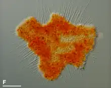 Vampyrellids are traditionally considered filose amoebae, i.e. they generate slender pseudopodia (filopodia). They are naked, devoid of external structures such as scales, cell coats or a glycocalyx, although there may be a temporary mucilage coat in the trophozoite stage. The trophozoites vary greatly in shape, size and color between species, but can be grouped into three cell states or 'morphotypes': isodiametric, expanded, and 'filoflabellate'.[1][2]