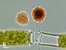 - The immobile but highly metabollically active 'digestive cyst' stage, that appears after the feeding. In some species it is called a 'resting phase', but it is different from a true resting cyst (or spore) that is metabollically inactive to survive adverse conditions. To reach this stage, the trophozoite retracts its filopodia, secretes a layered cell wall, and strongly attaches itself to the substrate or floats freely. Either a central main vacuole or multiple separate vacuoles appear to digest the food. The cytoplasm color may change to a bright red, orange or yellow color, or remain colorless. When the digestive phase is finished, one or multiple trophozoites hatch from the cyst through holes in the cell wall.[2]