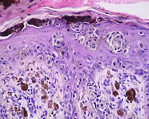 Acral lentiginous melanoma is an aggressive type of skin cancer. Melanoma is a group of serious skin cancers that arise from pigment cells (melanocytes); acral lentiginous melanoma is a kind of lentiginous[6] skin melanoma.[7][8] Acral lentiginous melanoma is the most common subtype in people with darker skins and is rare in people with lighter skin types. It is not caused by exposure to sunlight or UV radiation, and wearing sunscreen does not protect against it. Acral lentiginous melanoma is commonly found on the palms, soles, under the nails, and in the oral mucosa. It occurs on non-hair-bearing surfaces of the body, which have not necessarily been exposed to sunlight. It is also found on mucous membranes.[9]