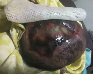 Acrania is a rare congenital disorder that occurs in the human fetus in which the flat bones in the cranial vault are either completely or partially absent.[1] The cerebral hemispheres develop completely but abnormally.[1] The condition is frequently, though not always, associated with anencephaly. The fetus is said to have acrania if it meets the following criteria: the fetus should have a perfectly normal facial bone, a normal cervical column but without the fetal skull and a volume of brain tissue equivalent to at least one-third of the normal brain size.[2]