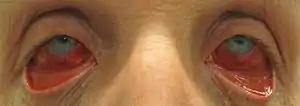 | Acute hemorrhagic conjunctivitis with the eyelid pulled down for a more complete view | |