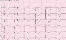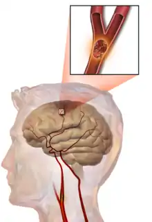 The biggest risk factor for stroke is high blood pressure.[7] Other risk factors include high blood cholesterol, tobacco smoking, obesity, diabetes mellitus, a previous TIA, end-stage kidney disease, and atrial fibrillation.[2][7][8] An ischemic stroke is typically caused by blockage of a blood vessel, though there are also less common causes.[13][14][15] A hemorrhagic stroke is caused by either bleeding directly into the brain or into the space between the brain's membranes.[13][16] Bleeding may occur due to a ruptured brain aneurysm.[13] Diagnosis is typically based on a physical exam and supported by medical imaging such as a CT scan or MRI scan.[9] A CT scan can rule out bleeding, but may not necessarily rule out ischemia, which early on typically does not show up on a CT scan.[10] Other tests such as an electrocardiogram (ECG) and blood tests are done to determine risk factors and rule out other possible causes.[9] Low blood sugar may cause similar symptoms.[9]
