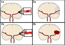 There are two main categories of strokes. Ischemic (top), typically caused by a blood clot in an artery (1a) resulting in brain death to the affected area (2a). Hemorrhagic (bottom), caused by blood leaking into or around the brain from a ruptured blood vessel (1b) allowing blood to pool in the affected area (2b) thus increasing the pressure on the brain.