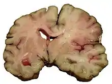 A slice of brain from the autopsy of a person who had an acute middle cerebral artery (MCA) stroke
