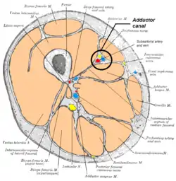 The canal contains the superficial femoral artery, the femoral vein, and branches of the femoral nerve (specifically, the saphenous nerve, and the nerve to the vastus medialis).[1][2] The femoral artery with its vein and the saphenous nerve enter this canal through the superior foramen. Then, the saphenous nerve and artery and vein of genus descendens exit through the anterior foramen, piercing the vastoadductor intermuscular septum. Finally, the femoral artery and vein exit via the inferior foramen (usually called the hiatus) through the inferior space between the oblique and medial heads of adductor magnus.[3]