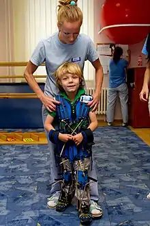 For many years, the Penguin suit was used successfully with astronauts to help them prevent disability. As Russia became more open, the technology for this early "therapy suit" was shared with those who work in rehabilitation. Reasoning that the effects of weightlessness were very similar to the physical problems seen in motor disorder patients, they decided to modify the suits for use with patients with cerebral palsy. At the Pediatric Institute of the Russian Academy of Medical Sciences, a team developed the first therapeutic suit in the early 1990s.[9] Two major co-inventors of the suit - Professor Inessa Kozlovskaya and Professor Xenia Semenova - have decided to transfer the advantages of their device to treatment of patients with severe neurologic conditions, especially children. In 1994, the "loading and training device" was patented all over the world through World Intellectual Property Organization with its application in medicine – mainly in rehabilitation of cerebral palsy and similar neurologic conditions.[10]