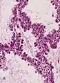 Nonmucinous AIS is thought to derive from a transformed cell in the distal airways and terminal respiratory units, and often shows features of club cell or Type II pneumocyte differentiation.[4] Mucinous AIS, in contrast, probably derives from a transformed glandular cell in distal bronchioles.[5]
