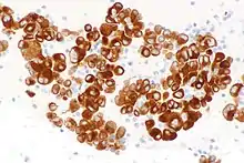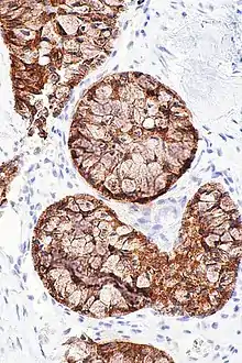 Adenocarcinoma of the lung tends to stain mucin positive as it is derived from the mucus-producing glands of the lungs. Similar to other adenocarcinoma, if this tumor is well differentiated (low grade) it will resemble the normal glandular structure. Poorly differentiated adenocarcinoma will not resemble the normal glands (high grade) and will be detected by seeing that they stain positive for mucin (which the glands produce). Adenocarcinoma can also be distinguished by staining for TTF-1, a cell marker for adenocarcinoma.[27]