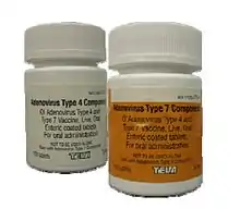 It was used by the United States military from 1971 to 1999, but was discontinued when the only manufacturer stopped production.[2][3] This vaccine elicited immunity to adenovirus serotypes 4 and 7,[4] the serotypes most often associated with acute respiratory disease. On March 16, 2011, the U.S. Food and Drug Administration approved an adenovirus vaccine manufactured by Teva Pharmaceuticals under contract to the U.S. Army.[5] This vaccine is essentially the same as the one used from 1971 to 1999. On October 24, 2011, the military services began administering the new adenovirus vaccine to recruits during basic training.[6]