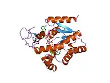 Adenylate kinase (EC 2.7.4.3) (also known as ADK or myokinase) is a phosphotransferase enzyme that catalyzes the interconversion of the various adenosine phosphates (ATP, ADP, and AMP). By constantly monitoring phosphate nucleotide levels inside the cell, ADK plays an important role in cellular energy homeostasis.