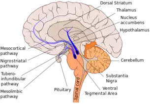 Dopamine, a neurotransmitter, has been linked with feeding behaviors. In an experiment, scientists measured how much food and water mice consumed when they were born without dopamine in their systems. They found that without dopamine, the mice would starve and be dehydrated to the point of death. The scientists then injected the mice without dopamine with its precursor, L-DOPA, and the mice started eating again. But, even though the mice were born without dopamine in their systems, they still had the capacity to control their feeding and drinking behaviors, suggesting that dopamine does not play a role in developing those neural circuits. Instead, dopamine is more closely related to the drive for hunger and thirst. Although the lack of dopamine resulted in adipsia in these rats, low levels of dopamine do not necessarily cause adipsia. [9]