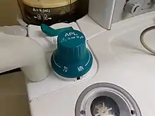 Such valves were first described by the American dentist Jay Heidbrink, who used a thin disc that was held in place by a spring.[2] The valve is adjustable and spring-loaded, allowing the opening pressure of the valve to be controlled by screwing the valve top which modifies the pressure on the spring.[1] A very light spring is used, so that at its minimum setting the valve can be opened by the patient's breathing alone using low pressures.[3] In contemporary APL valves, three orifices or "ports" are present: one for intake of gas, one for return of gas to the patient, and an exhaust port for waste gas which can be connected to a scavenging system.[1][4]