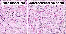 Study of the reported cases indicate that most adrenocortical adenomas occur due to neoplastic proliferation of adrenal cortical cells within the three distinct layers of adrenal cortex. In humans, the adrenal cortex comprises three concentric zones including the zona glomerulosa, zona fasciculata, and zona reticularis that under normal conditions respond to body's physiological demands for steroid hormones. The adrenal cortex is considered a dynamic organ in which senescent cells are replaced by newly differentiated cells. This constant renewal facilitates organ remodeling which contributes to dynamic characteristics of the adrenal cortex. [7] correspondingly, the developmental physiology of the adrenal cortex is believed to play a pivotal role in formation of the adrenocortical tumors. Hence, the molecular mechanisms involved in normal development of the adrenal glands are like double edged swords that can lead to the formation of tumors within the adrenal cortex. Moreover, recent studies suggest that mutations affecting the molecular pathways of the adrenocortical region can stimulate abnormal proliferation and tumor formation. Through these studies, the cyclic AMP-dependent protein kinase A signaling has been identified as a key mediator of cortisol secretion, and the mutations associated with the dysregulation of cyclic AMP - protein kinase A pathways have been implicated in the adrenocortical pathophysiology.[8]