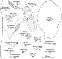 Some cause asthma, such as Alternaria alternata. A drawing of a very small "dust" seed from the flower Orchis maculata is provided for comparison.[50][51]