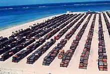 The first batch of herbicides was unloaded at Tan Son Nhut Air Base in South Vietnam, on January 9, 1962.[42] U.S. Air Force records show at least 6,542 spraying missions took place over the course of Operation Ranch Hand.[43] By 1971, 12 percent of the total area of South Vietnam had been sprayed with defoliating chemicals, at an average concentration of 13 times the recommended U.S. Department of Agriculture application rate for domestic use.[44] In South Vietnam alone, an estimated 39,000 square miles (10,000,000 ha) of agricultural land was ultimately destroyed.[45] In some areas, TCDD concentrations in soil and water were hundreds of times greater than the levels considered safe by the EPA.[46][47]
