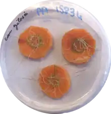 The hairy roots are grown in vitro in bioreactors to study their soil interaction with other pathogens like fungi and nematodes. This technique has also led to the commercial production of certain metabolic compounds that the plant is known to secrete, especially in regard to the medicinal plants that are difficult to cultivate in sufficient quantities by other means.[6] The root cultures are also used for genetic engineering.[7][8]