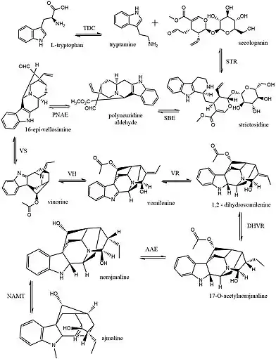 Ajmaline is widely dispersed among 25 plant genera, but is of significant concentration in the Apocynaceae family.[5] Ajmaline is a monoterpenoid indole alkaloid, composed of an indole from tryptophan and a terpenoid from iridoid glucoside secologanin. Secologanin is introduced from the triose phosphate/pyruvate pathway.[6] Tryptophan decarboxylase (TDC) remodels tryptophan into tryptamine. Strictosidine synthase (STR), uses a Pictet–Spengler reaction to form strictosidine from tryptamine and secologanin. Strictosidine is oxidized by P450-dependent sarpagan bridge enzymes (SBE); to make polyneuridine aldehyde. Of the sarpagan-type alkaloids, polyneuridine is a key entry into the ajmalan-type alkaloids.[7][8] Polyneuridine Aldehyde is methylated by polyneuridine aldehydeesterase (PNAE), to synthesize 16-epi-vellosimine, which is acetylated to vinorine by vinorine synthase (VS). Vinorine is oxidized by vinorine hydroxylase (VH) to make vomilenine. Vomilenine reductase (VR) conducts a reduction of vomilenine to 1,2-dihydrovomilenine, using the cofactor NADPH. 1,2-dihydrovomilenine, is reduced by 1,2-dihydrovomilenine reductase (DHVR) to 17-O-acetylnorajmaline, with the same cofactor as VR: NADPH. 17-O-acetylnorajmaline is deacetylated by acetylajmalan esterase (AAE), to form norajmaline. Finally, norajmaline methyl transferase (NAMT) methylates norajmaline resulting in our desired compound: ajmaline.[9]