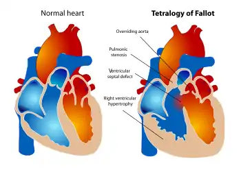 Common signs of Alagille syndrome include congenital heart problems varying from heart murmurs to significant structural abnormalities, such as Tetralogy of Fallot, Pulmonary Stenosis, overriding aorta, ventricular septal defect, and right ventricular hypertrophy are common amongst Alagille patients. Patients may also present with Ventricular septal defect, Atrial septal defect, Patent ductus arteriosus, and Coarctation of the aorta. The mortality rate of Tetralogy of Fallot when untreated ranges from 70% by age 10 to 95% by age 40. However, complete surgical repair can significantly improve both longevity and quality of life in patients with Alagille syndrome.