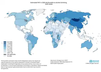 3.6% of all cancer cases and 3.5% of cancer deaths worldwide are attributable to consumption of alcohol (more specifically, acetaldehyde, a metabolic derivative of ethanol).[6] 740,000 cases of cancer in 2020 or 4.1% of new cancer cases were attributed to alcohol.[3][2]