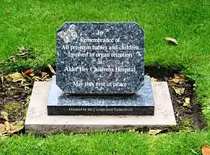 Until a public inquiry in 1999, the general public was unaware that Alder Hey and other hospitals within the National Health Service (NHS) were retaining patients' organs without family consent.[4]