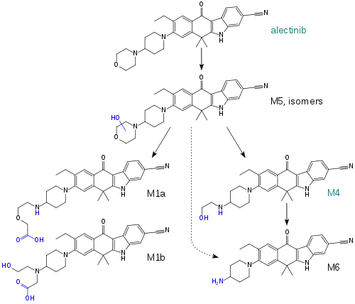 When taken with a meal, the absolute bioavailability of the drug is 37%, and highest blood plasma concentrations are reached after four to six hours. Steady state conditions are reached within seven days. Plasma protein binding of alectinib and M4 is over 99%. The enzyme mainly responsible for alectinib metabolism is CYP3A4; other CYP enzymes and aldehyde dehydrogenases only play a small role. Alectinib and M4 account for 76% of the circulating substance, while the rest are minor metabolites.[12][13]