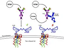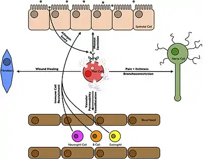 Common allergens include pollen and certain foods.[11] Metals and other substances may also cause such problems.[11] Food, insect stings, and medications are common causes of severe reactions.[2] Their development is due to both genetic and environmental factors.[2] The underlying mechanism involves immunoglobulin E antibodies (IgE), part of the body's immune system, binding to an allergen and then to a receptor on mast cells or basophils where it triggers the release of inflammatory chemicals such as histamine.[13] Diagnosis is typically based on a person's medical history.[3] Further testing of the skin or blood may be useful in certain cases.[3] Positive tests, however, may not necessarily mean there is a significant allergy to the substance in question.[14]