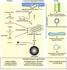 The aggregation mechanism of alpha-synuclein is uncertain. There is evidence of a structured intermediate rich in beta structure that can be the precursor of aggregation and, ultimately, Lewy bodies.[105] A single molecule study in 2008 suggests alpha-synuclein exists as a mix of unstructured, alpha-helix, and beta-sheet-rich conformers in equilibrium. Mutations or buffer conditions known to improve aggregation strongly increase the population of the beta conformer, thus suggesting this could be a conformation related to pathogenic aggregation.[106] One theory is that the majority of alpha-synuclein aggregates are located in the presynapse as smaller deposits which causes synaptic dysfunction.[107] Among the strategies for treating synucleinopathies are compounds that inhibit aggregation of alpha-synuclein. It has been shown that the small molecule cuminaldehyde inhibits fibrillation of alpha-synuclein.[108] The Epstein-Barr virus has been implicated in these disorders.[109]