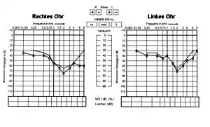 Alport syndrome can also cause hearing loss although some patients are not affected.[10] Hearing in Alport syndrome patients is normal at birth. Hearing loss in affected patients develops progressively, usually at the stage when kidney function is normal, but there is substantial proteinuria. However, in some patients, hearing loss is only noted after kidney function has been lost. Characteristically the early changes are reduced ability to hear high-frequency sounds, 'sensorineural deafness'. This becomes more severe and affects lower frequencies too. Hearing loss is not usually complete in Alport syndrome; good communication is almost always possible with the use of hearing aids.[11]