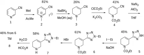 Alkylation of nicotinonitrile (accessible from nicotinamide)[5] (1) with methyl iodide affords the N-methylpyridinium salt (2). The reduction of this intermediate with sodium borohydride gives 3-cyano-N-methyl-1,2,5,6-tetrahydropyridine [5657-66-9] (3). Reaction with ethyl chloroformate results in N-demethylation and consequent formation of the corresponding carbamate [120241-16-9] (4). The nitrile group is then transformed to a tetrazole by reaction with sodium azide in the presence of aluminum chloride giving CID:9991151 (5). The surrogate acid is then alkylated with ethyl iodide to afford CID:10106197 (6). Treatment with acid then removes the carbamate on the ring nitrogen giving Lu-25-077 [221549-70-8] (7). The methyl group on the piperidine ring restored using formaldehyde and formic acid under standard Eschweiler–Clarke conditions, yielding alvameline (8).